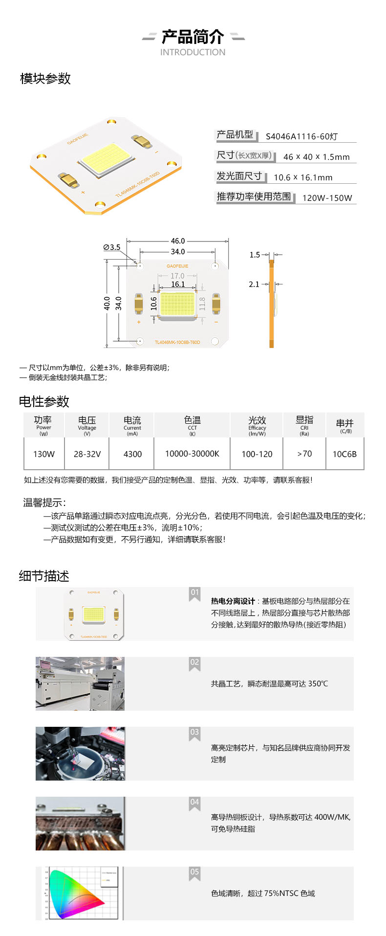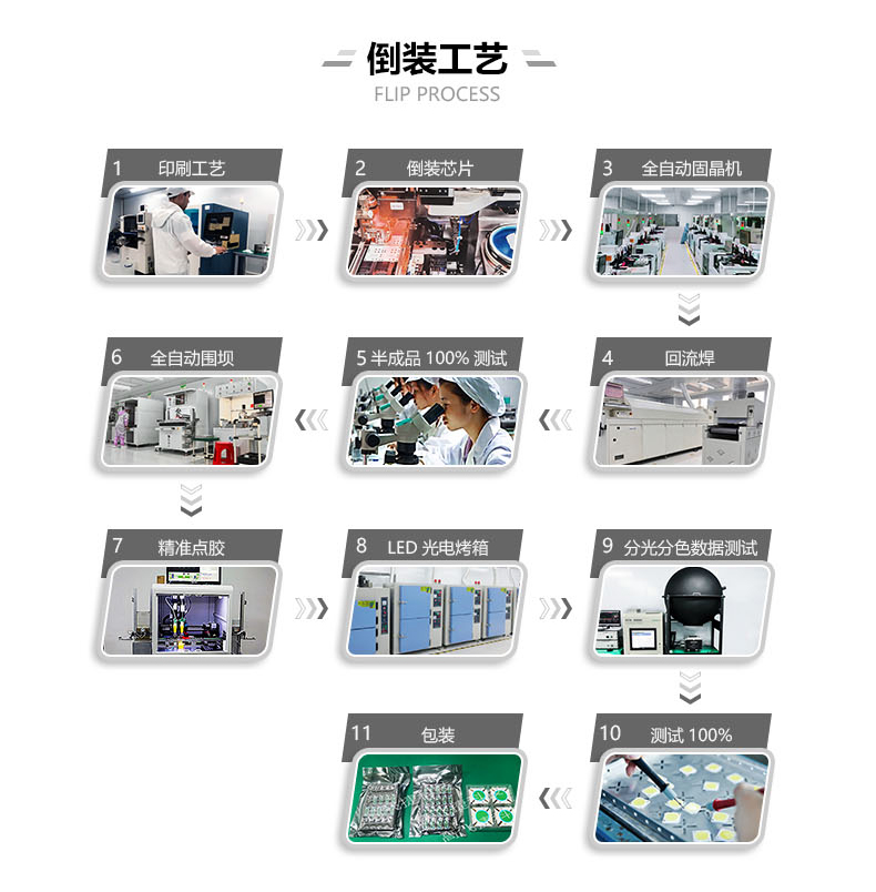 1、采用倒裝LED封裝,自主研發新型焊接工藝使晶片與基本連接更牢固、可靠性好、死燈 率大大降低;